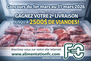 - Un prix : 6 mois de viande, jusqu’à concurrence de 2 500$ CAD.